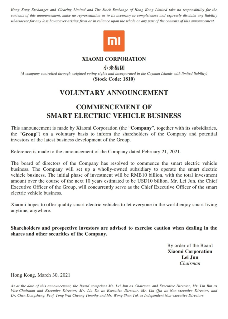 L’investimento iniziale ammonta a 10 miliardi di Yuan ($1,5 miliardi), ma Xiaomi ha sottolineato che negli ultimi dieci anni ha investito già più di 10 miliardi per questa nuova categoria di attività.
